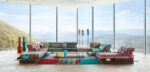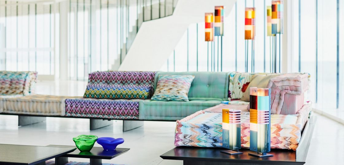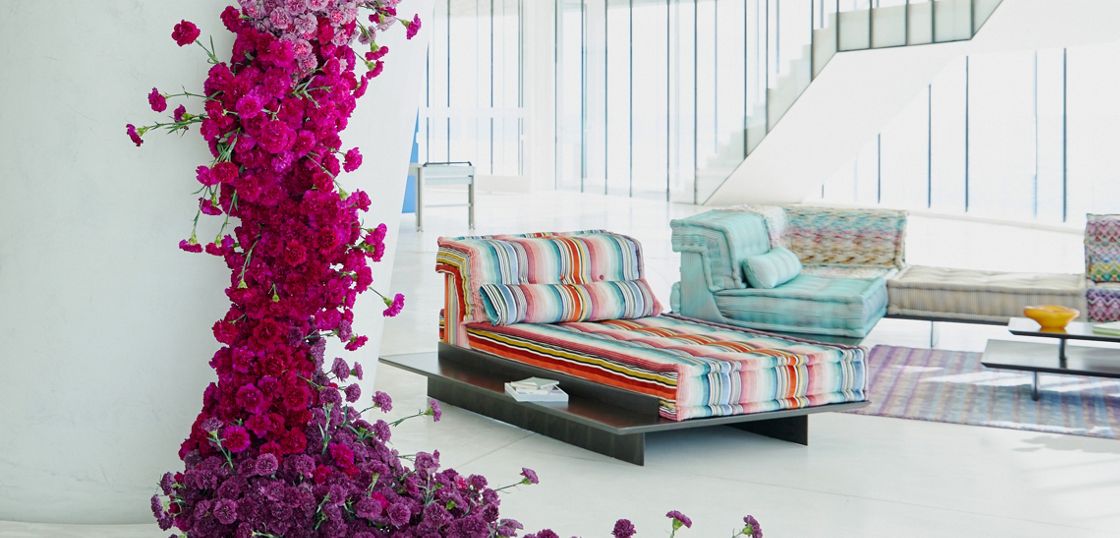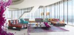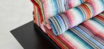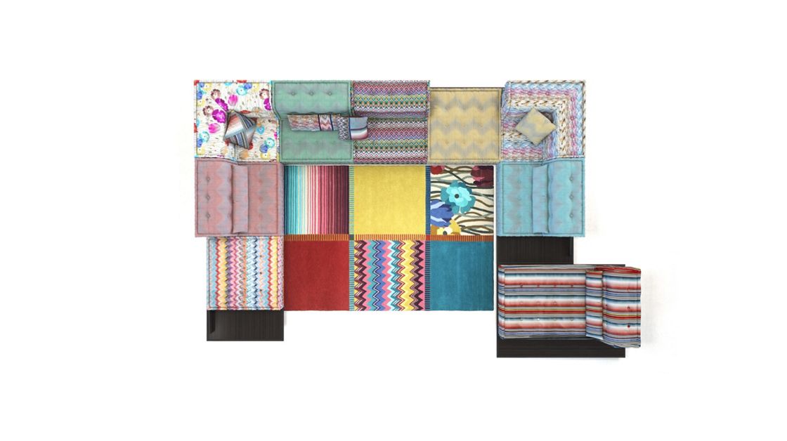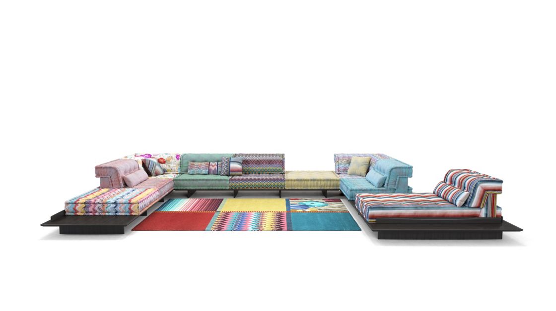 Canapé composable par éléments MAH JONG habillé de tissus.