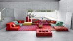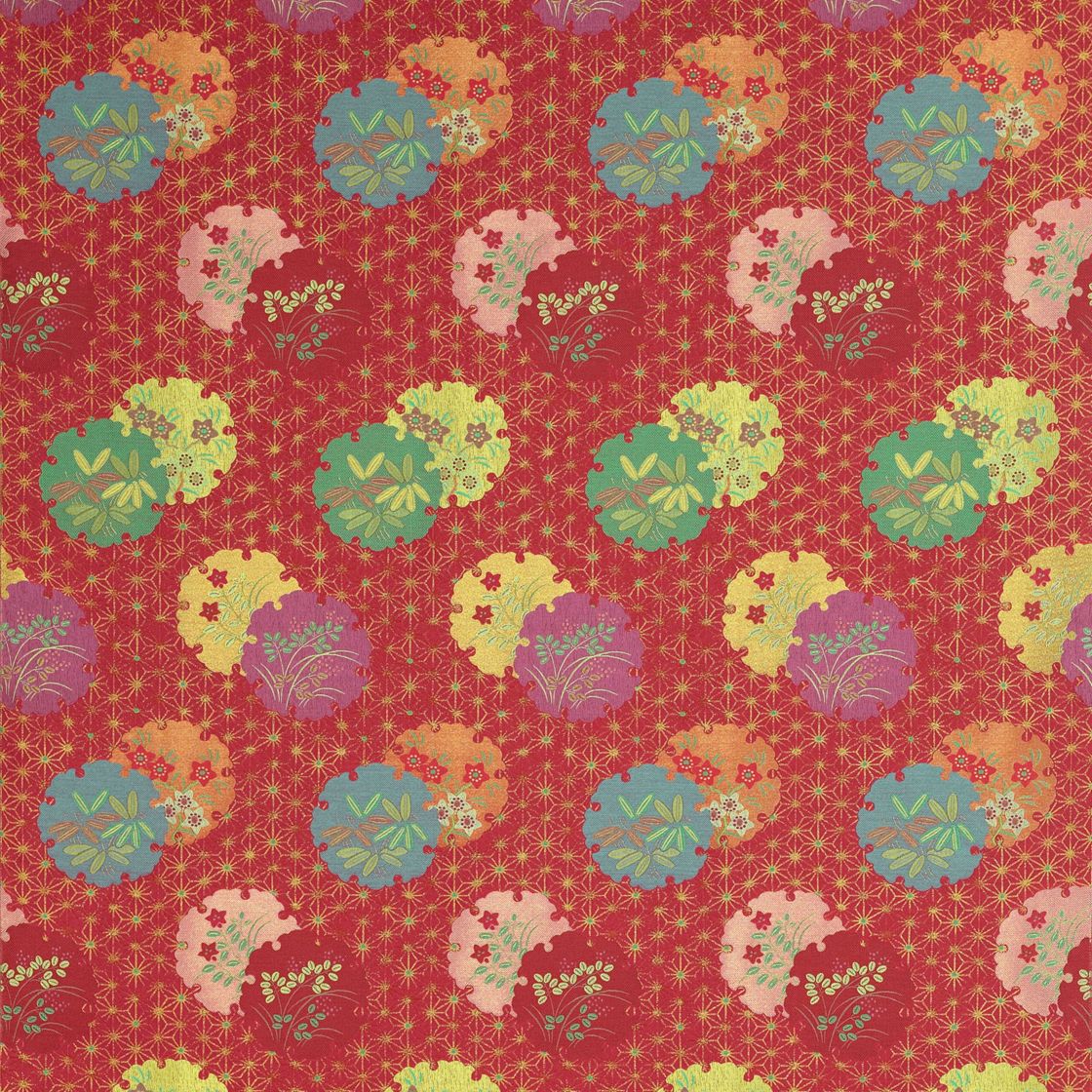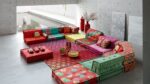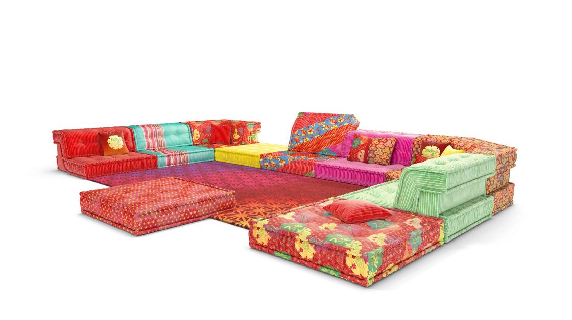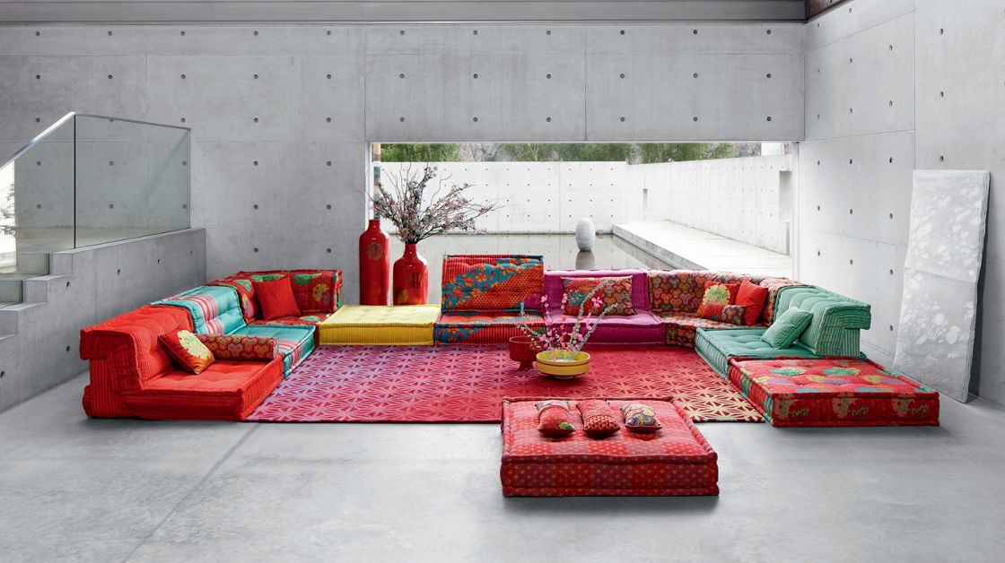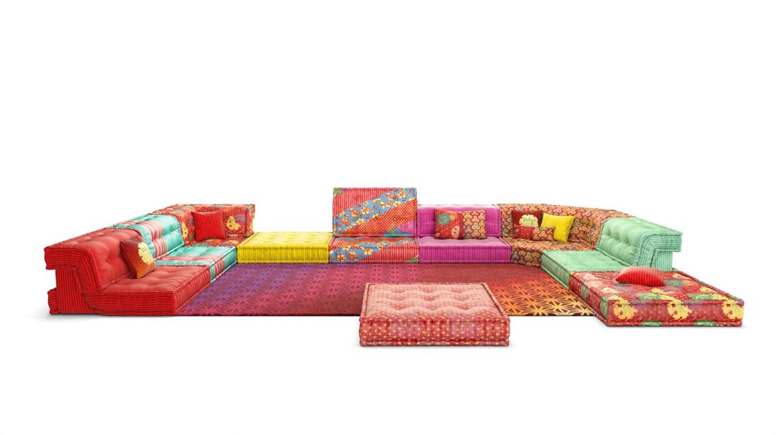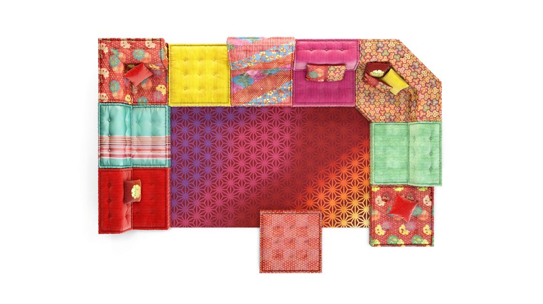 Canapé composable par éléments habillé de tissus dessinés par Kenzo Takada, collection No Gaku. Système modulaire composable à l’infini à partir de coussins d’assise (L.95 x H.19 X P.95 cm) et de dossiers droits et d’angles (H.53 cm). Tous les éléments sont capitonnés, matelassés et réalisés à la main. Mécanisme de dossier relevable et petits coussins en option. Coutures faites à la main en fil ciré Blanc.