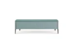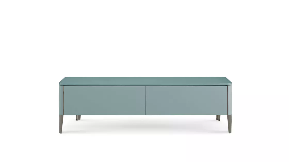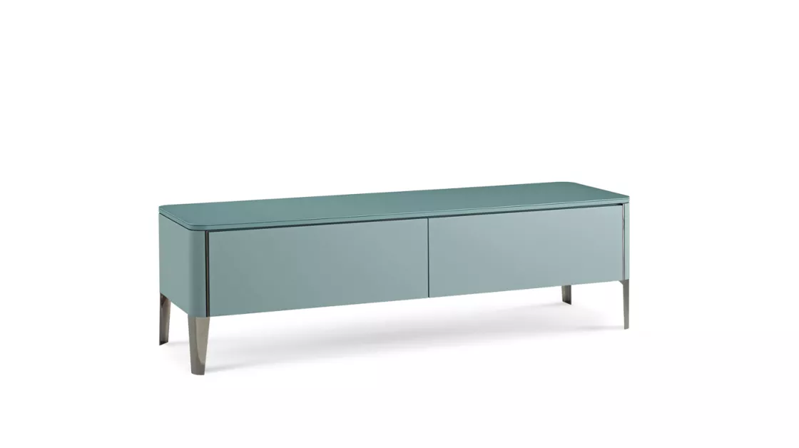 Meuble TV avec 2 abattants réalisé en panneaux de fibre de densité moyenne laqué (mat ou brillant) ou plaqué Alpi® (placage reconstitué) avec un plateau au choix en laque mate ou brillant, en verre laqué, en placage Alpi® ou en céramique. Pieds galbés en acier chromé noir.