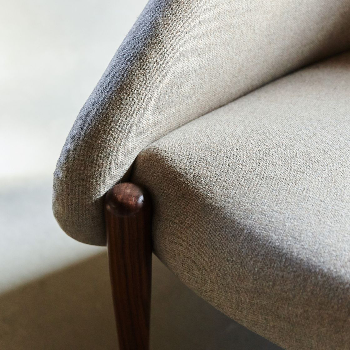 Ce fauteuil au look scandinave semble tenir en équilibre sur ses deux pieds avant. Il repose, à l’arrière, sur son dossier qui descend jusqu’au sol